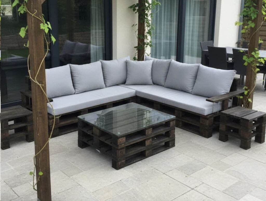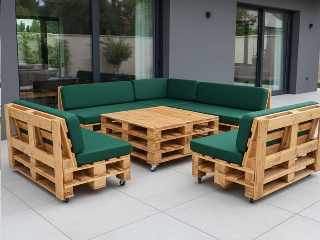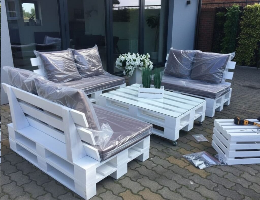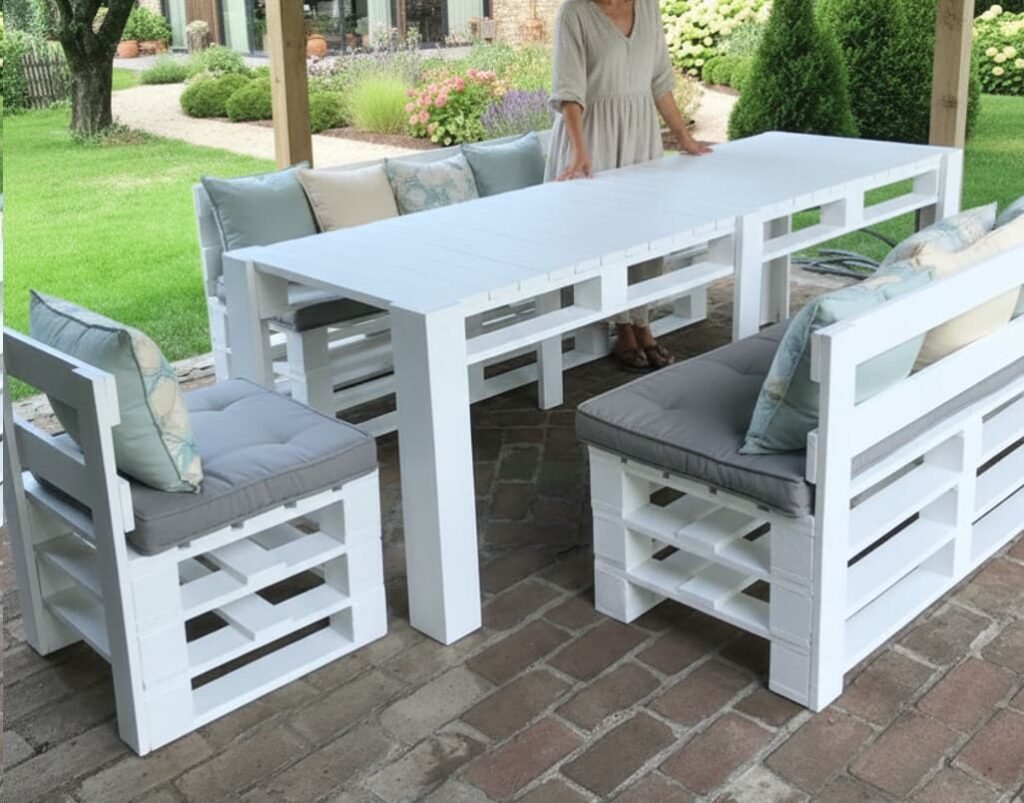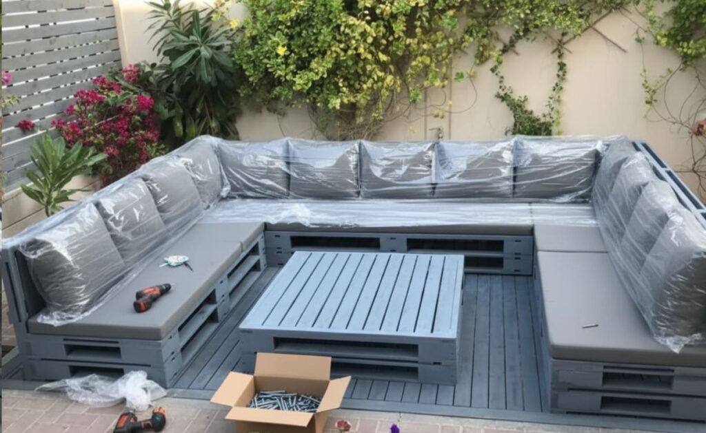 Довольно популярна садовая мебель из паллет, так как она не требует особого ухода и, пройдя обработку для защиты от влаги, будет служить вам не один сезон. Вы можете заказать скамьи и столы из поддонов, а так же лежаки и шезлонги. Желательно использовать съёмные матрасы, подушки и сиденья, чтобы избежать заноз.