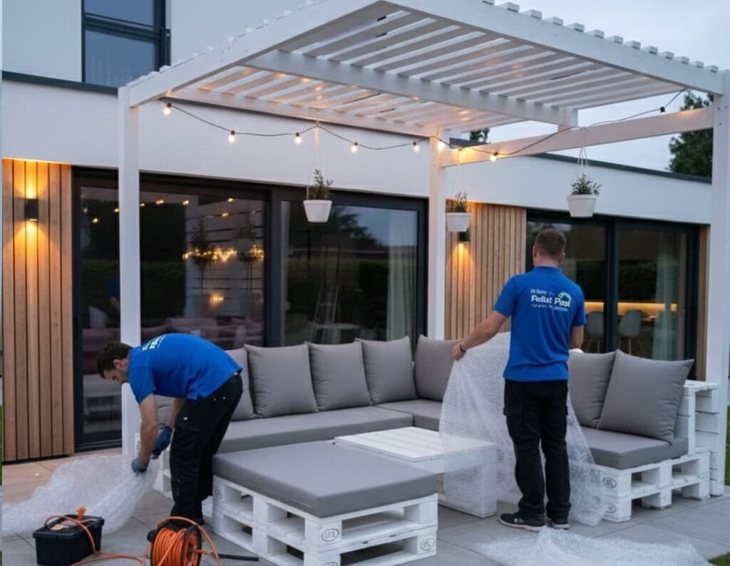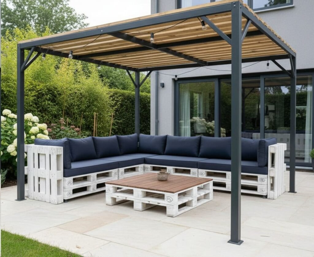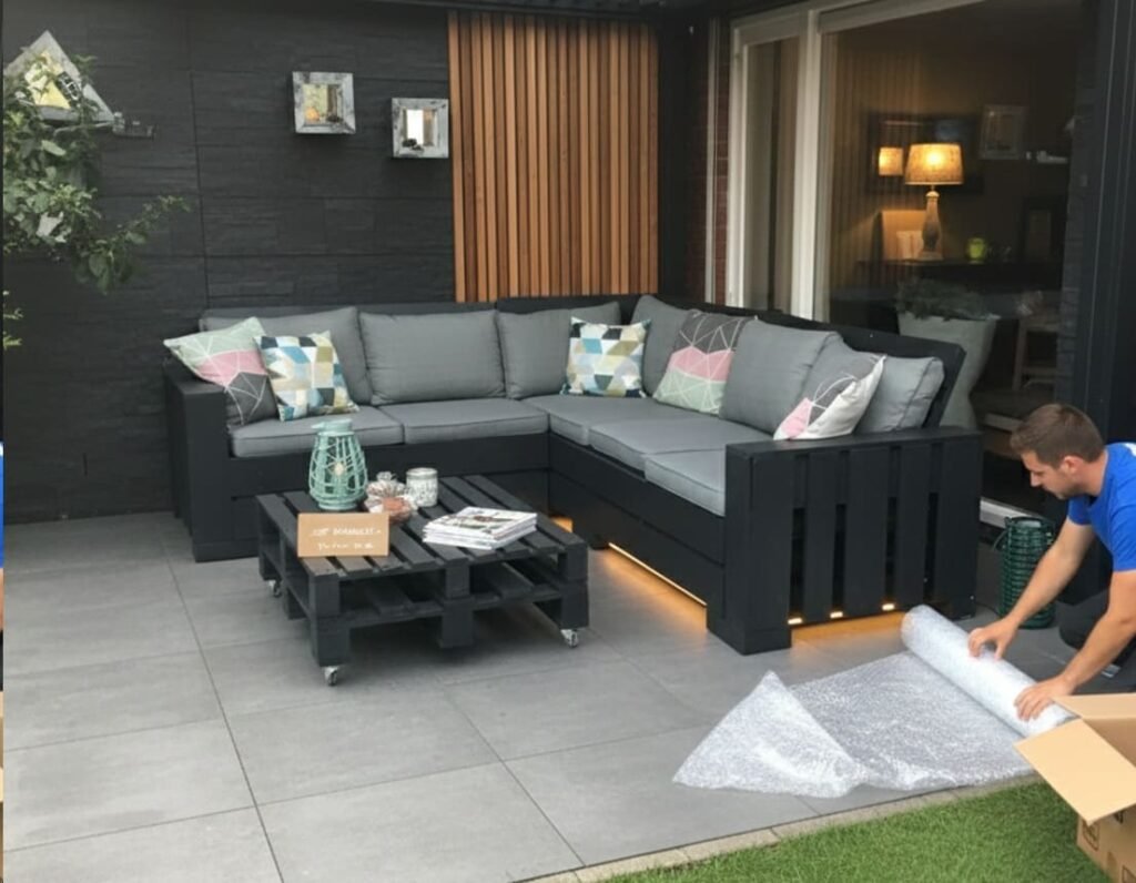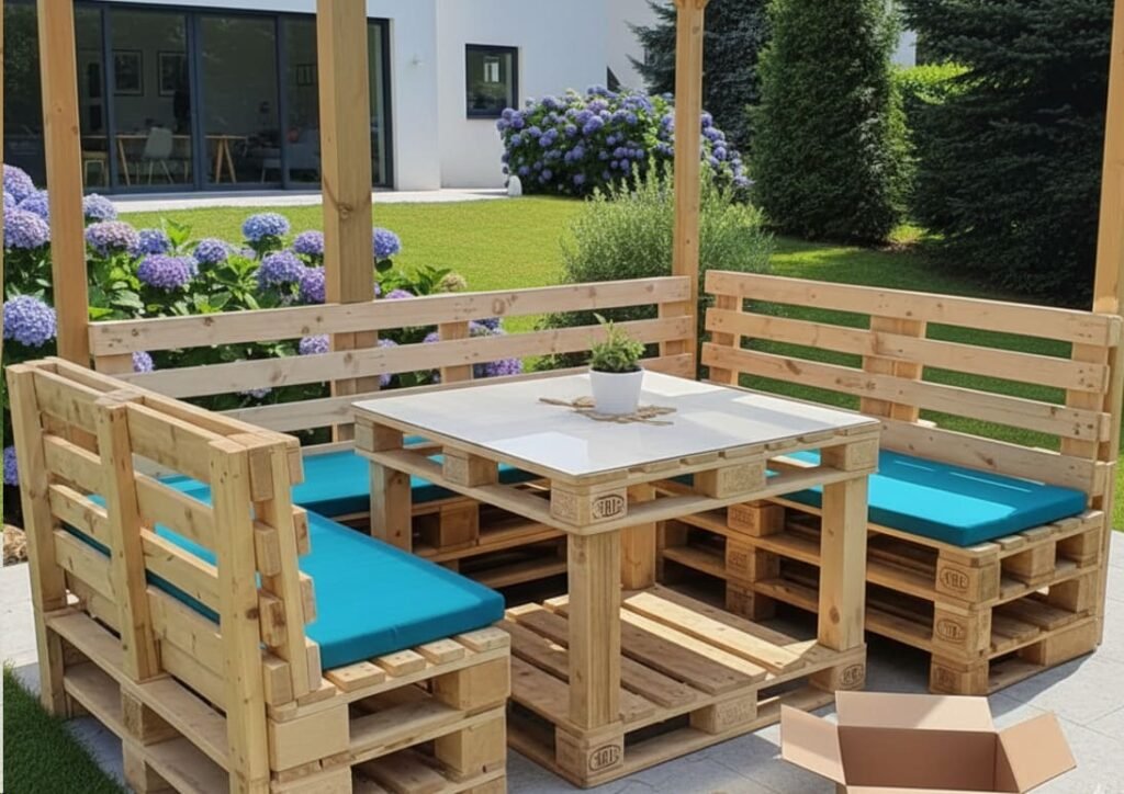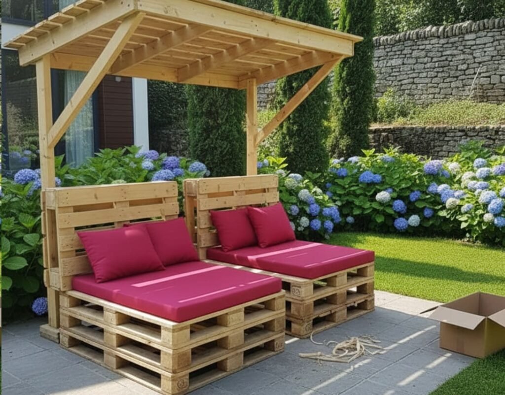 Довольно популярна садовая мебель из паллет, так как она не требует особого ухода и, пройдя обработку для защиты от влаги, будет служить вам не один сезон. Вы можете заказать скамьи и столы из поддонов, а так же лежаки и шезлонги. Желательно использовать съёмные матрасы, подушки и сиденья, чтобы избежать заноз.
