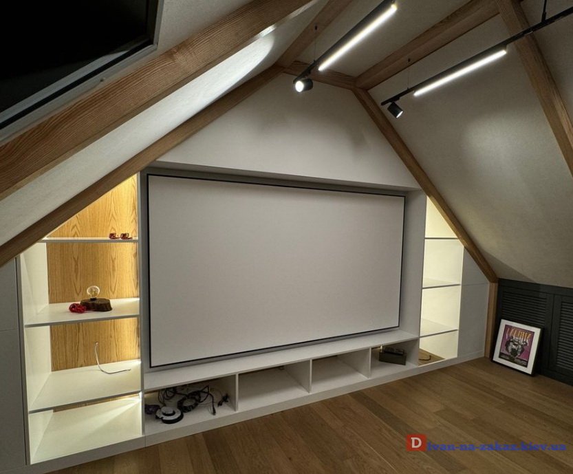 - Вбудовані шафи та стелажі: Ідеальне рішення для зберігання речей, книг, декору. Ми можемо створити шафи, що повторюють контури скошених стін, з різноманітними секціями, полицями та висувними ящиками.